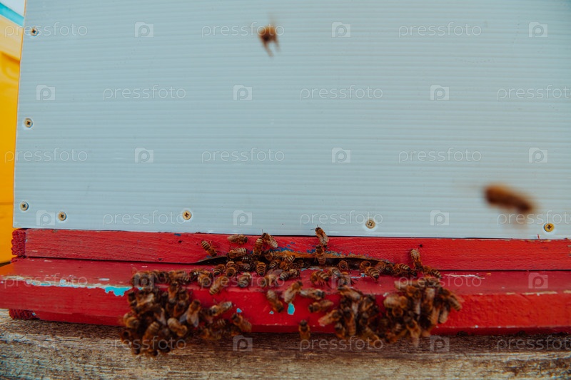 Крупным планом фотография пчел, парящих вокруг улья, несущих пыльцу