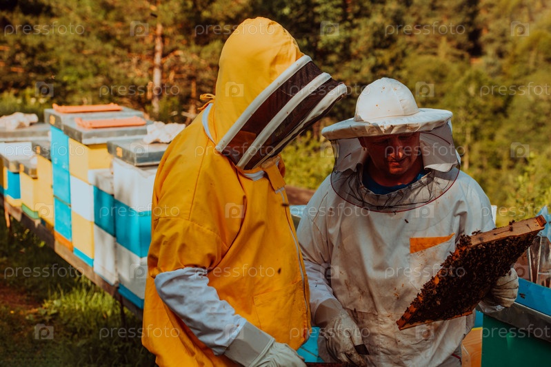 Пчеловоды проверяют мед на рамке улья в поле. Владельцы малого бизнеса на пасеке. Производитель натуральных здоровых продуктов питания работает с пчелами и ульями на пасеке