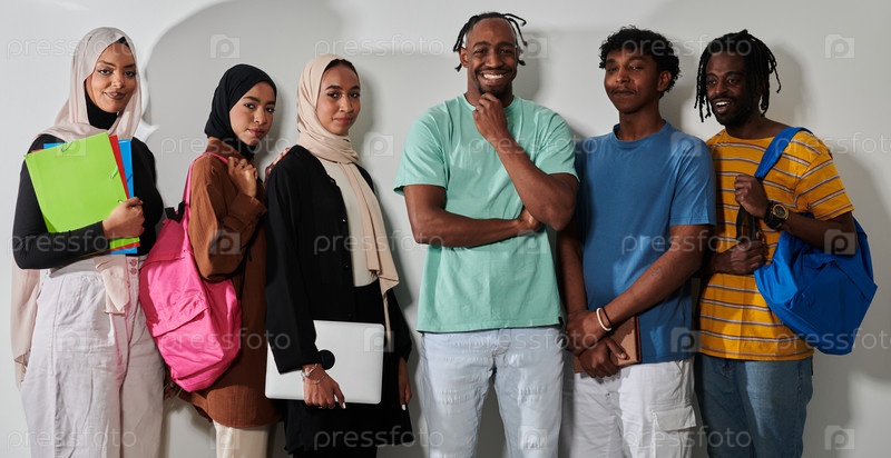 Ярко демонстрируя образовательное разнообразие, группа студентов принимает позу на чистом белом фоне, держа в руках рюкзаки, ноутбуки и планшеты, символизируя сочетание современных технологий, единства и культурной инклюзивности в их академическом путешес