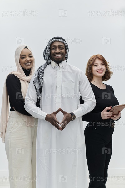 Арабский бизнесмен уверенно стоит рядом с двумя деловыми женщинами, изображая уравновешенную и разнообразную команду, олицетворяющую амбиции, инновации и дальновидное лидерство на первозданном белом фоне