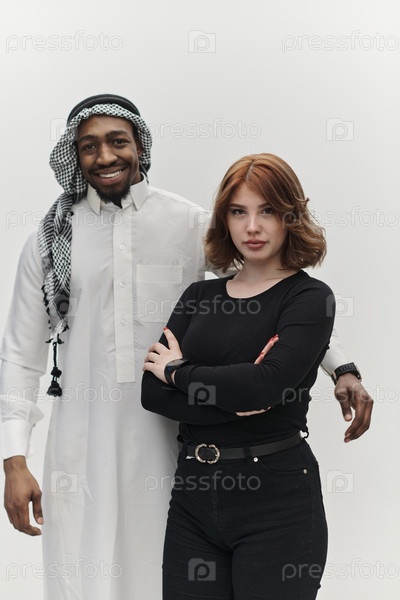 Мусульманский предприниматель и современная рыжеволосая девушка вместе позируют на чистом белом фоне, олицетворяя уверенность, разнообразие и динамичный предпринимательский дух в их партнерстве