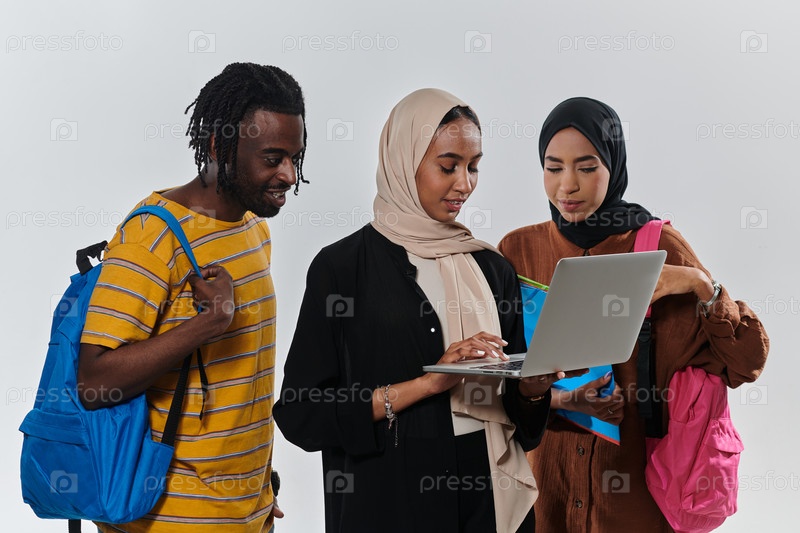 Группа студентов, в том числе афроамериканка и две женщины в хиджабе, стоят вместе на первозданно белом фоне, символизируя гармоничное сочетание культур и традиций в стремлении к знаниям и академическому совершенству