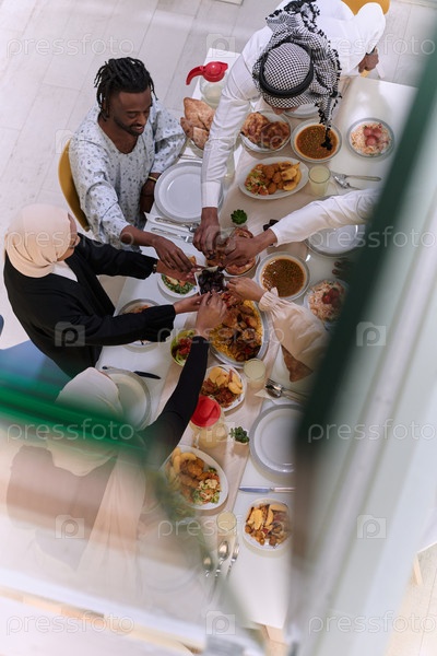Вид сверху: разные руки мусульманской семьи деликатно сжимают свежие финики, символизируя прекращение поста во время священного месяца Рамадан, запечатлевая момент культурного единства, общих традиций и радостного ожидания общего ифтара