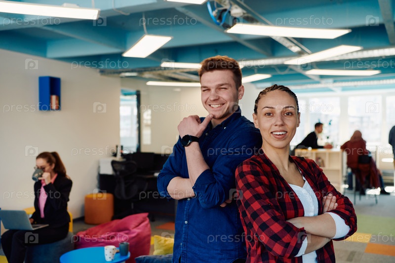 Портрет успешного творческого бизнесмена и деловой женщины, смотрящей в камеру и улыбающейся. Разнообразные деловые люди стоят вместе при запуске