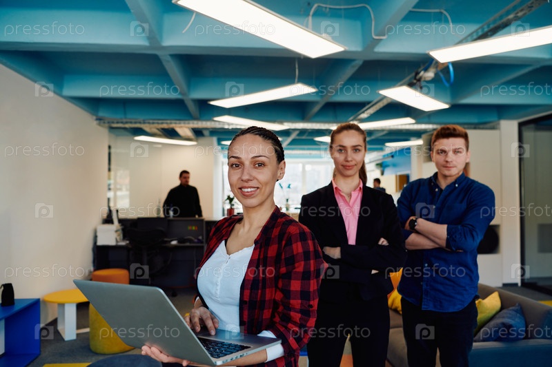 Молодая команда бизнес-профессионалов позирует для портрета офиса стартапа, излучая уверенность и амбиции, при этом одна женщина держит ноутбук, что символизирует инновации и сотрудничество в предпринимательстве