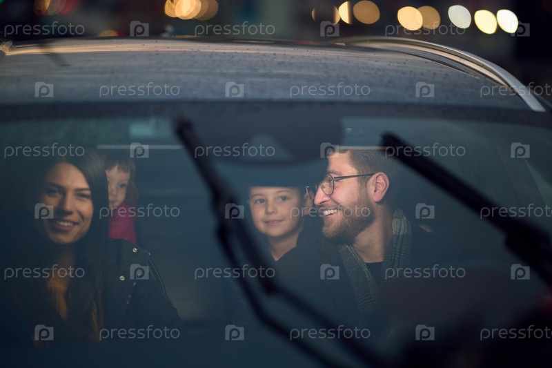 В ночные часы счастливая семья вместе наслаждается игровыми моментами в машине, путешествуя по ночной дороге, освещенной светом фар и наполненной смехом и радостью