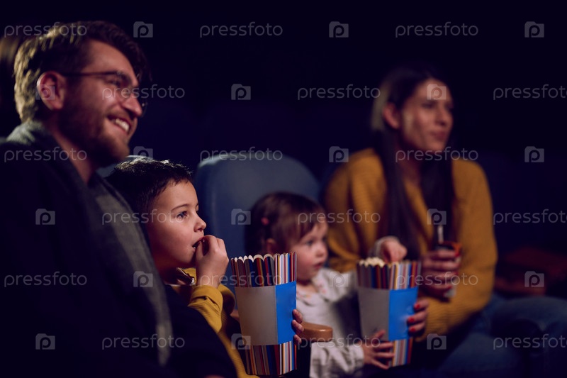 Современная семья приятно проводит время вместе в кинотеатре, наслаждаясь попкорном во время просмотра фильма со своими детьми