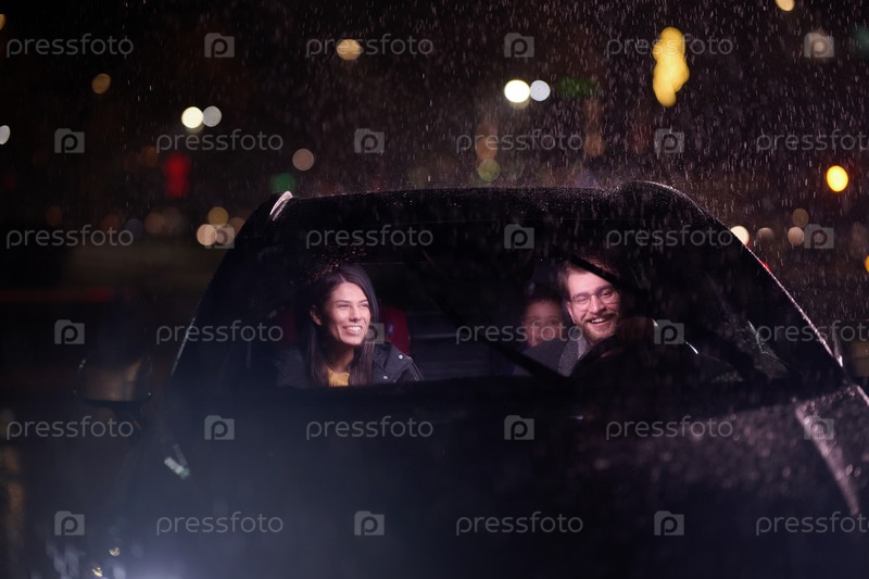 Посреди ночного путешествия счастливая семья наслаждается игровыми моментами в машине, путешествуя в дождливую погоду, освещенная светом фар, смехом и сплочением