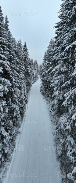 Туманный закат на Снежных горах с точки зрения воздушного беспилотника. Леса пересекают проселочные тропы в соснах зимой со свежей проселочной дорогой