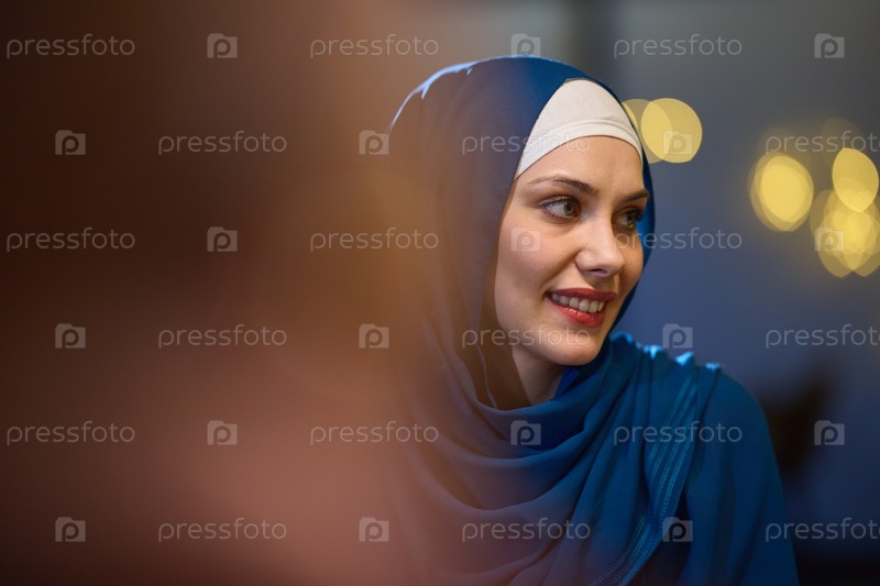 В современном ресторане красивая европейская мусульманка изящно наслаждается атмосферой и кулинарными изысками во время священного месяца Рамадан, воплощая элегантность и духовное спокойствие среди культурного праздника