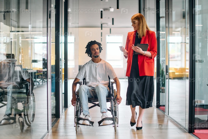 Бизнес-лидер со своим коллегой, афроамериканским бизнесменом-инвалидом, проходят мимо своих коллег, работающих в современных офисах