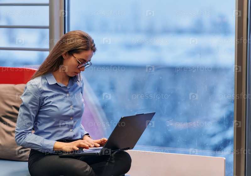 Деловая женщина использует свой ноутбук, сидя у окна большого корпоративного здания, на фоне которого открывается живописный вид на городской пейзаж