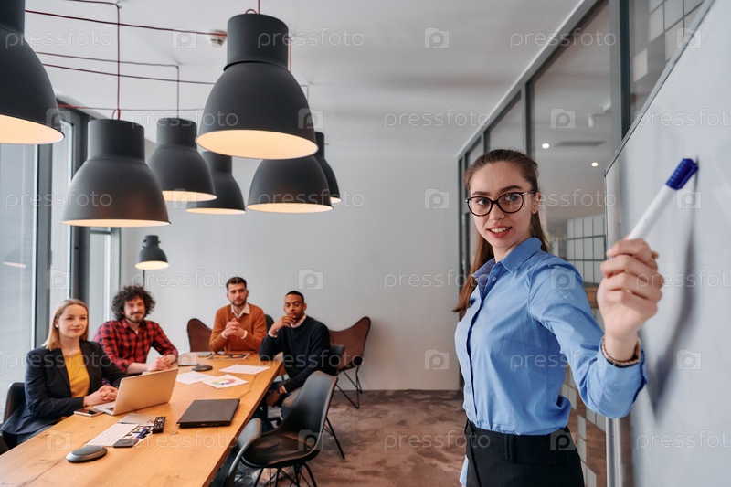 Бизнесмен, ведущая встречу с коллегами в современном офисе