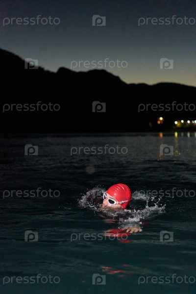 Решительный профессиональный триатлонист проходит тщательную ночную тренировку в холодной воде, демонстрируя преданность делу и стойкость в подготовке к предстоящим соревнованиям по триатлону по плаванию