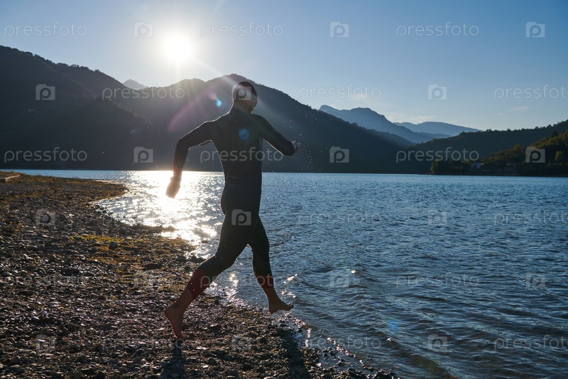 Спортсмен по триатлону начинает тренировку по плаванию на озере