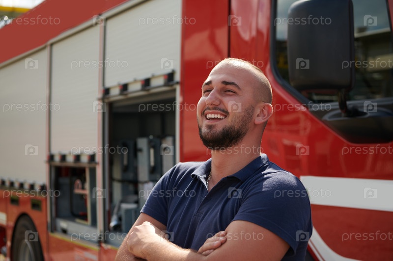Уверенный в себе пожарный стоит со скрещенными руками, излучая стойкость и готовность, готовый реагировать на чрезвычайные ситуации рядом с современной пожарной машиной, демонстрируя героизм и силу пожарной службы