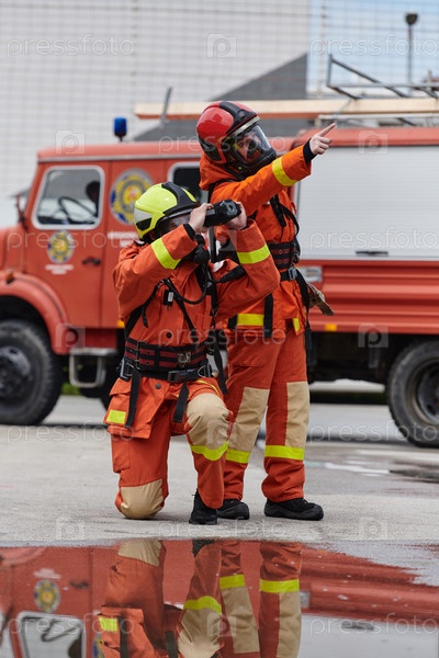 Команда пожарных изучает использование тепловизионной камеры во время тренировки