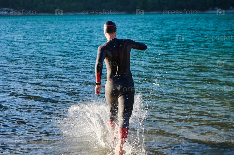 Спортсмен по триатлону начинает тренировку по плаванию на озере