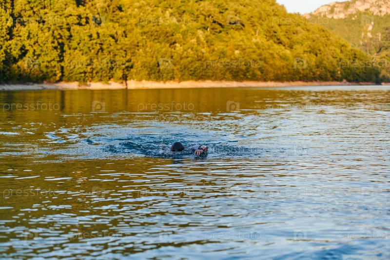 Спортсмен по триатлону плавает на озере на рассвете в гидрокостюме