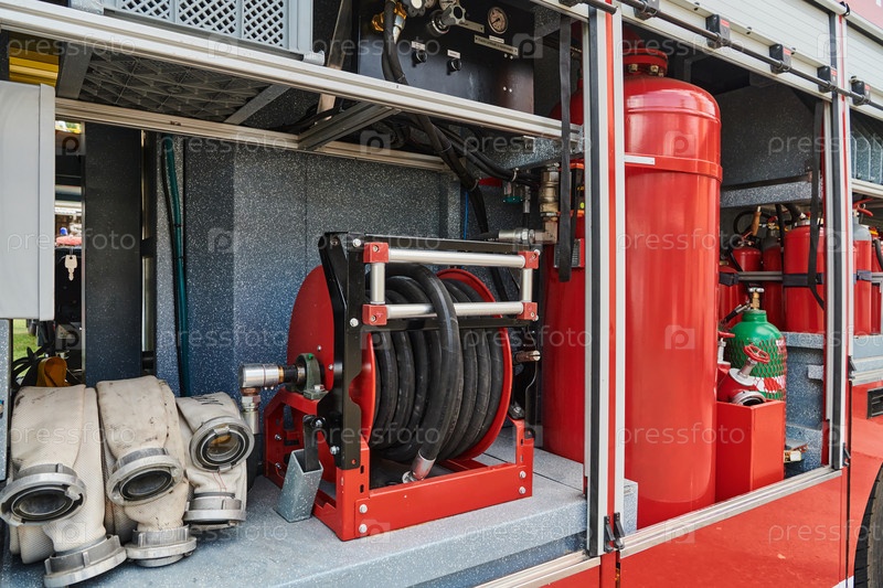 Крупный план основного противопожарного оборудования на современной пожарной машине, демонстрация инструментов и снаряжения, готовых к экстренному реагированию на опасные пожарные ситуации