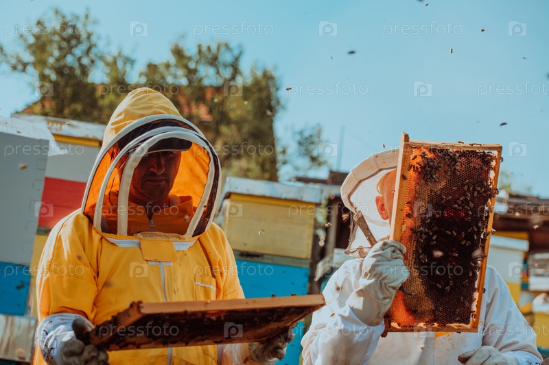 Пчеловоды проверяют мед на рамке улья в поле. Владельцы малого бизнеса на пасеке. Производитель натуральных здоровых продуктов питания работает с пчелами и ульями на пасеке