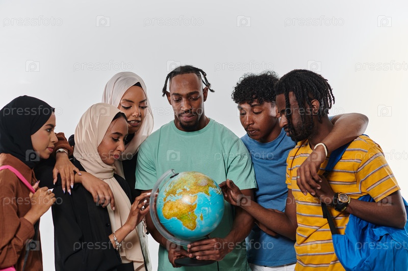 Разнообразная группа студентов собралась по всему миру, поглощенная исследованиями и учебой, их яркая энергия запечатлена на первозданном белом фоне, символизируя единство и любопытство в их образовательном путешествии