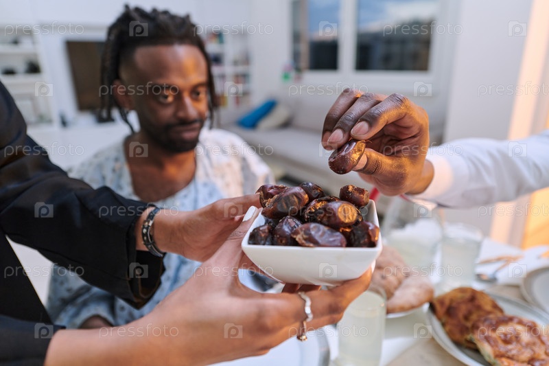 На пронзительном крупном плане разные руки мусульманской семьи деликатно сжимают свежие финики, символизируя прекращение поста во время священного месяца Рамадан, запечатлевая момент культурного единства, общих традиций и радостного ожидания общего ифтара