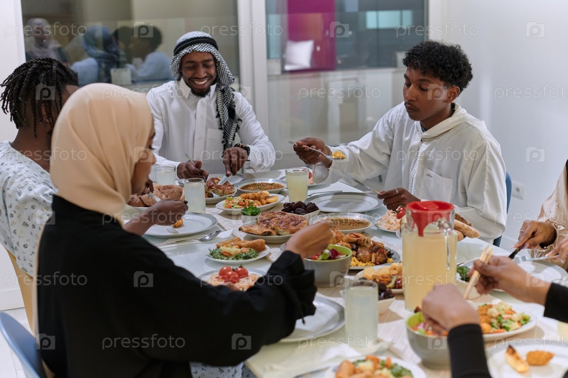 Традиционная и разнообразная мусульманская семья собирается вместе, чтобы разделить вкусный ифтар во время священного месяца Рамадан, воплощая суть семейной радости, культурного богатства и духовного единства в их общем празднике