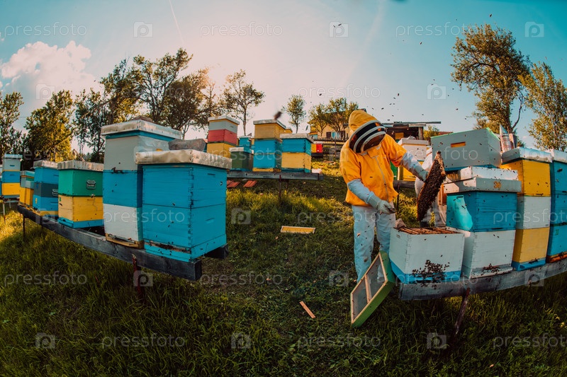 Пчеловод проверяет мед на рамке улья в поле. Пчеловод на пасеке. Пчеловод работает с пчелами и ульями на пасеке