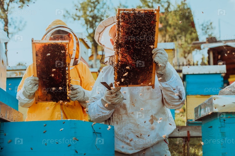 Пчеловоды проверяют мед на рамке улья в поле. Владельцы малого бизнеса на пасеке. Производитель натуральных здоровых продуктов питания работает с пчелами и ульями на пасеке