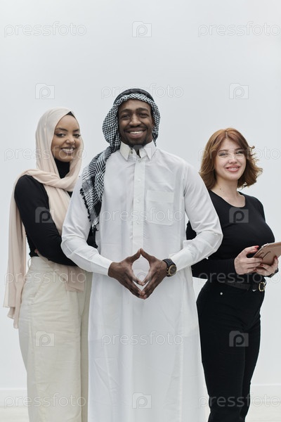 Арабский бизнесмен уверенно стоит рядом с двумя деловыми женщинами, изображая уравновешенную и разнообразную команду, олицетворяющую амбиции, инновации и дальновидное лидерство на первозданном белом фоне