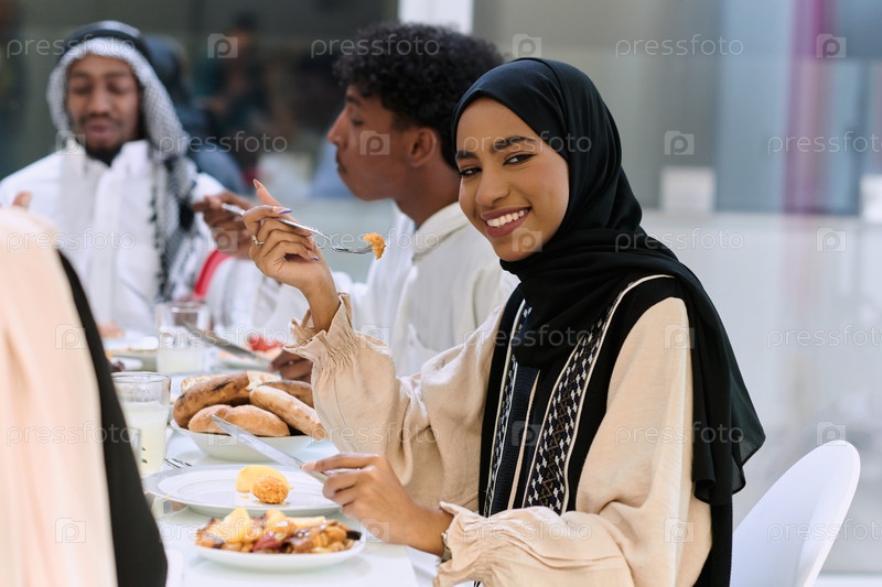 Традиционная и разнообразная мусульманская семья собирается вместе, чтобы разделить вкусный ифтар во время священного месяца Рамадан, воплощая суть семейной радости, культурного богатства и духовного единства в их общем празднике