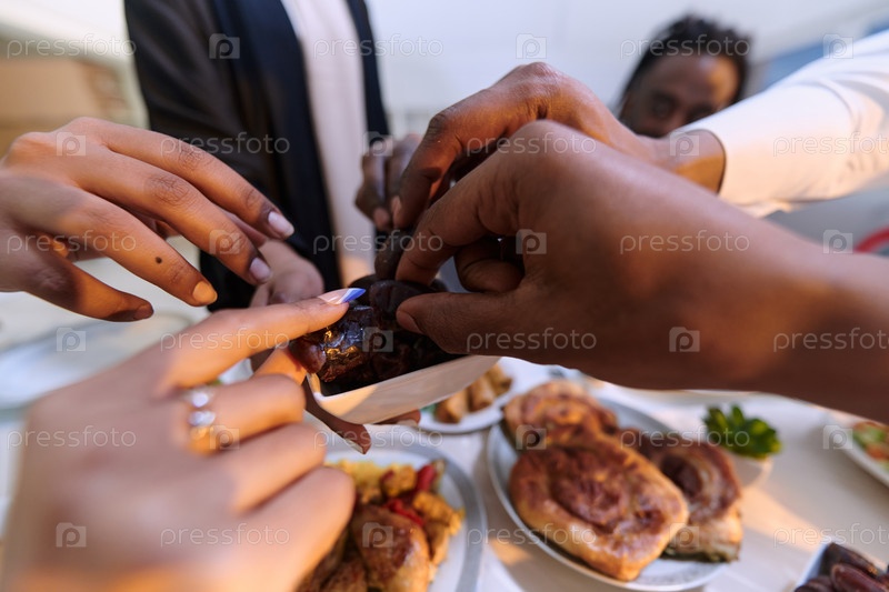 На пронзительном крупном плане разные руки мусульманской семьи деликатно сжимают свежие финики, символизируя прекращение поста во время священного месяца Рамадан, запечатлевая момент культурного единства, общих традиций и радостного ожидания общего ифтара