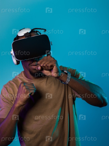 В авангардной сцене афроамериканец участвует в передовых играх виртуальной реальности, используя очки VR для погружения в футуристические боксерские игры, расположенные на ярко-синем фоне, демонстрируя плавное сочетание технологий, инноваций и взаимодейст