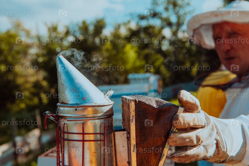 Пчеловод использует дым, чтобы успокоить пчел, и начинает проверять мед