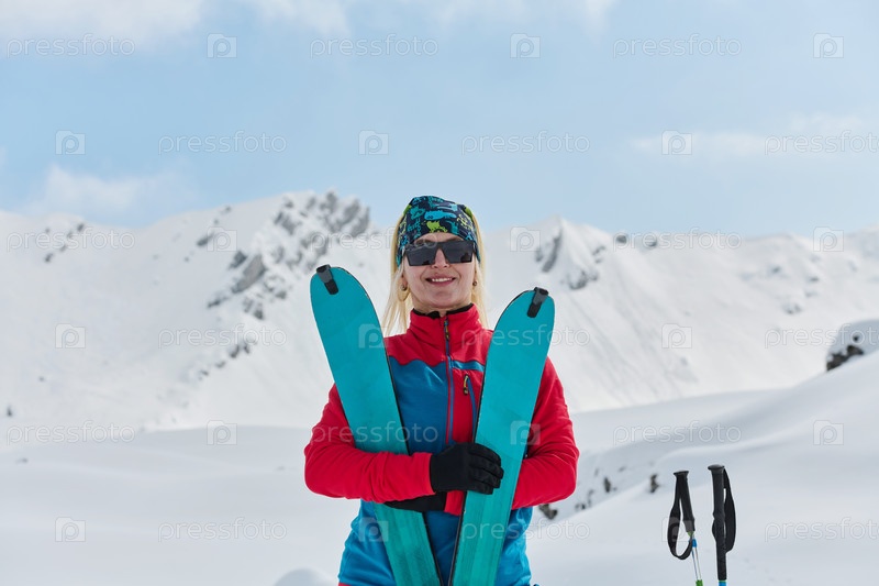 Профессиональная лыжница радуется успешному восхождению на заснеженные вершины Альп