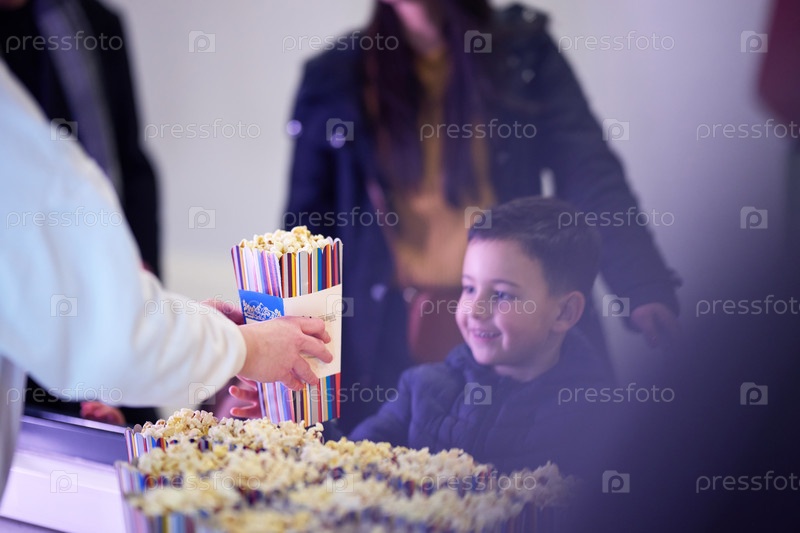 Мальчик покупает попкорн в кинотеатре перед началом фильма, его лицо сияет от волнения