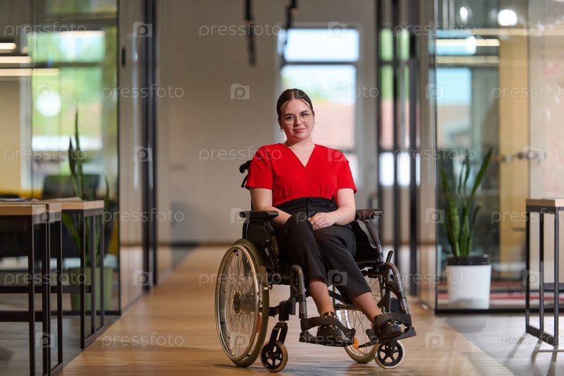 Современная молодая деловая женщина в инвалидной коляске окружена инклюзивным рабочим пространством со стеклянными стенами офисов, олицетворяющим решимость и новаторство в деловом мире