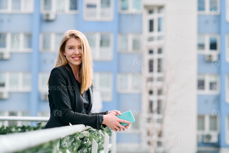 Блондинка-бизнесмен в черном костюме пользуется смартфоном во время перерыва в современной городской среде
