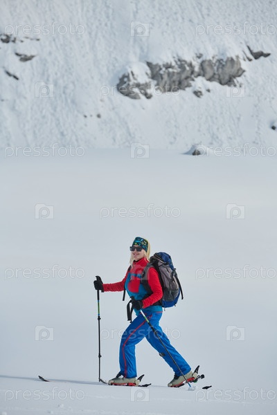 Женщина-альпинистка поднимается в Альпы со снаряжением для бэккантри