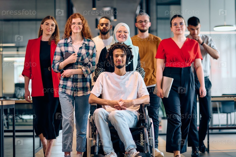 Разнообразная группа молодых бизнесменов, идущих по коридору в застекленном офисе современного стартапа, включая человека в инвалидной коляске и женщину в хиджабе