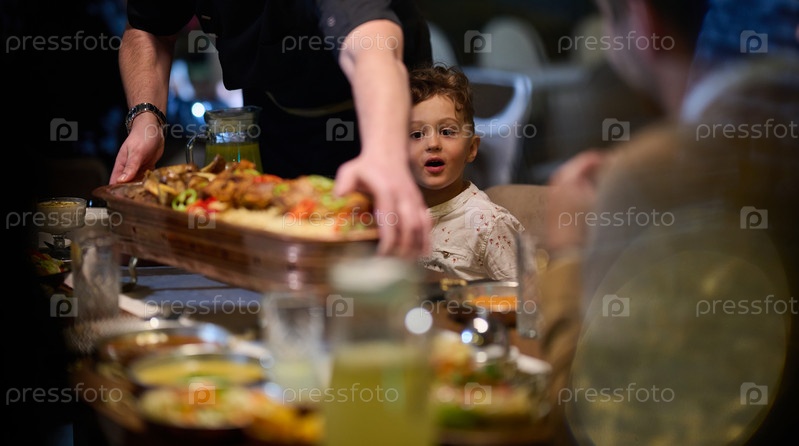 В трогательной сцене профессиональный шеф-повар подает ифтар европейской мусульманской семье во время священного месяца Рамадан, олицетворяя культурное единство и кулинарное гостеприимство в момент общего праздника и благодарности
