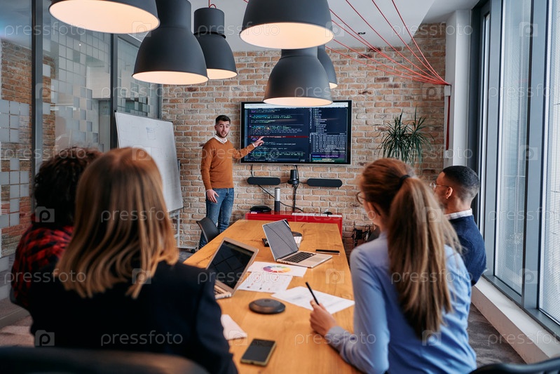 В корпоративной обстановке бизнесмен проводит встречу, страстно представляя бизнес-план своей внимательной команде, способствуя сотрудничеству и стратегическому мышлению
