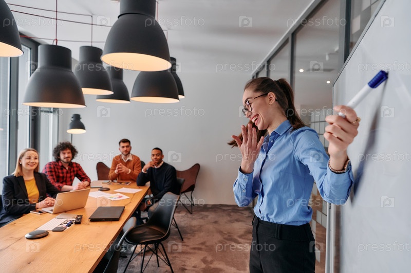 Бизнесмен, ведущая встречу с коллегами в современном офисе