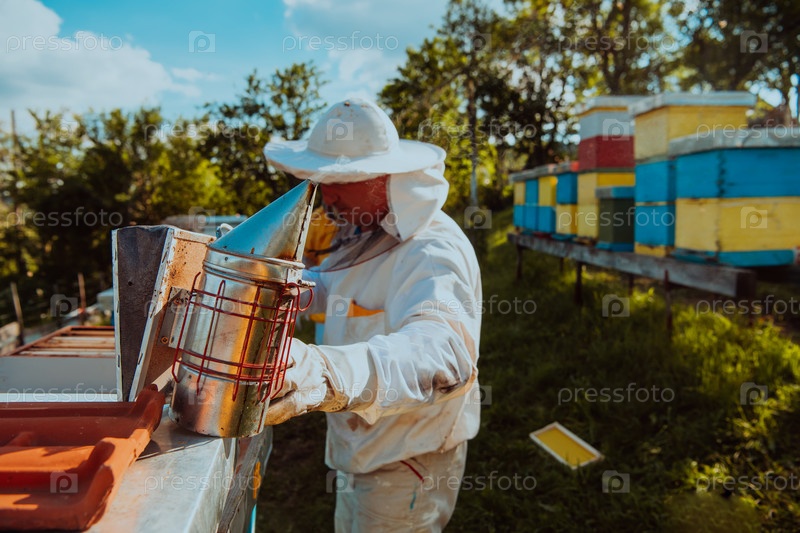 Пчеловод использует дым, чтобы успокоить пчел, и начинает проверять мед