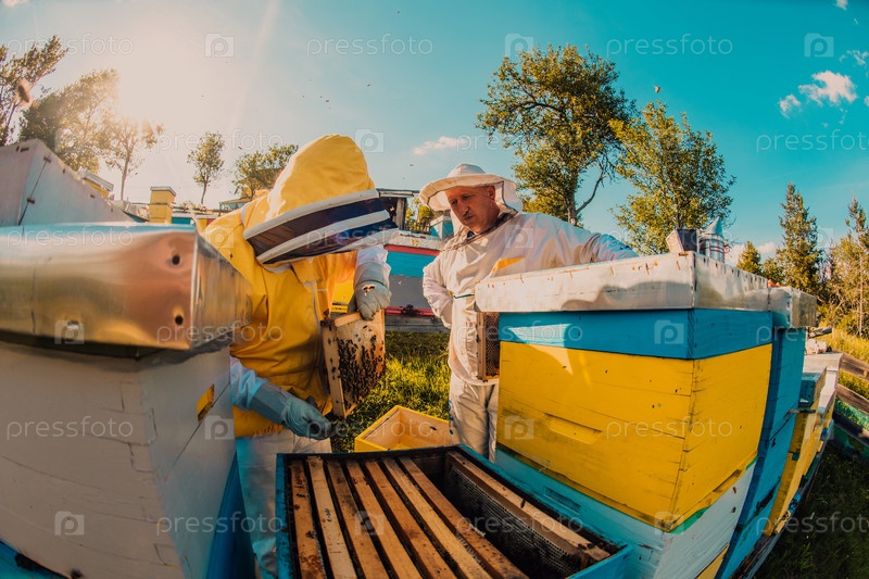 Пчеловоды проверяют мед на рамке улья в поле. Владельцы малого бизнеса на пасеке. Производитель натуральных здоровых продуктов питания работает с пчелами и ульями на пасеке