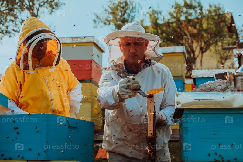 Пчеловоды проверяют мед на рамке улья в поле. Владельцы малого бизнеса на пасеке. Производитель натуральных здоровых продуктов питания работает с пчелами и ульями на пасеке