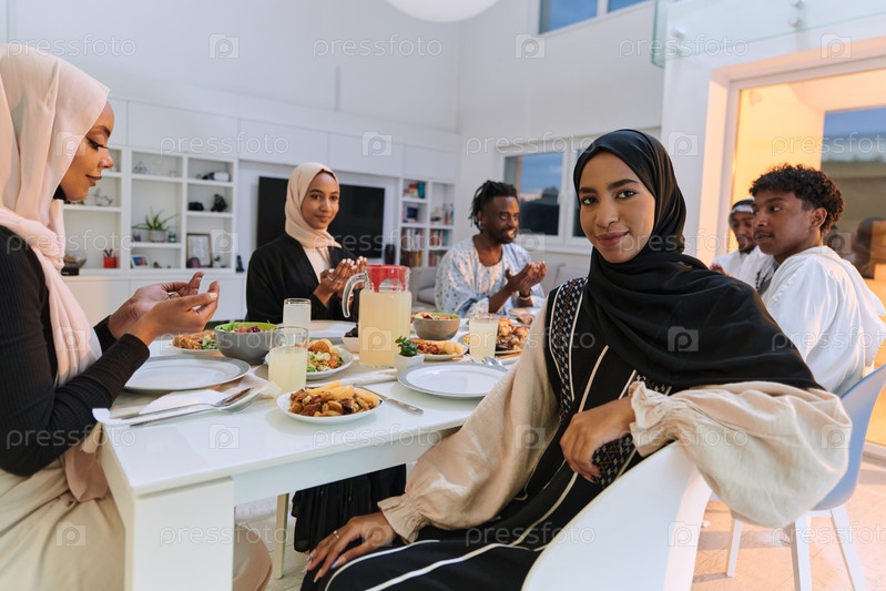 В священный месяц Рамадан разнообразная мусульманская семья объединяется в духовном единстве, горячо молясь Богу перед разговением, фиксируя момент коллективной преданности, культурного разнообразия и семейной радости посреди священного праздника