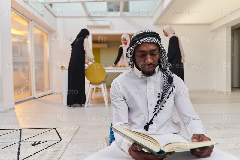 В священный месяц Рамадан афроамериканец-мусульманин, поглощенный чтением Священного Корана, окружен фоном, на котором три женщины в хиджабе готовят и подают еду для ифтара, изображая сцену духовной преданности, культурного единства и общественного праздн