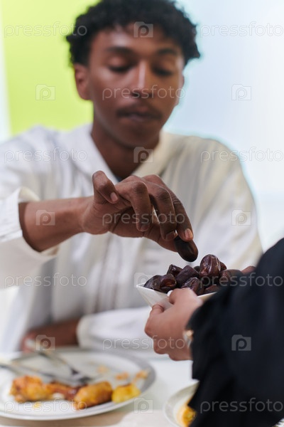 Афроамериканец-мусульманин деликатно выбирает финики, чтобы прервать пост во время месяца Рамадан, сидя за семейным обеденным столом, олицетворяя сцену духовных размышлений, культурных традиций и общего ожидания общего ифтара